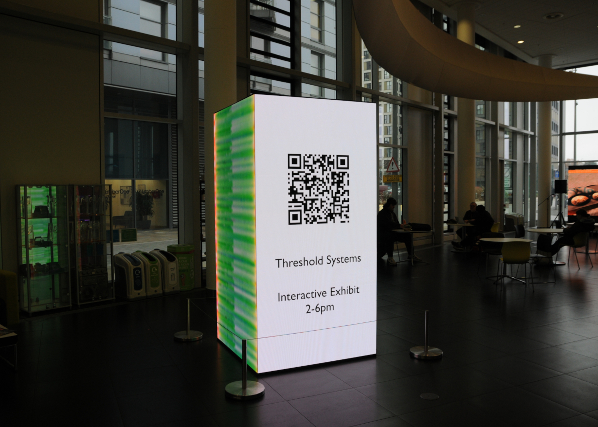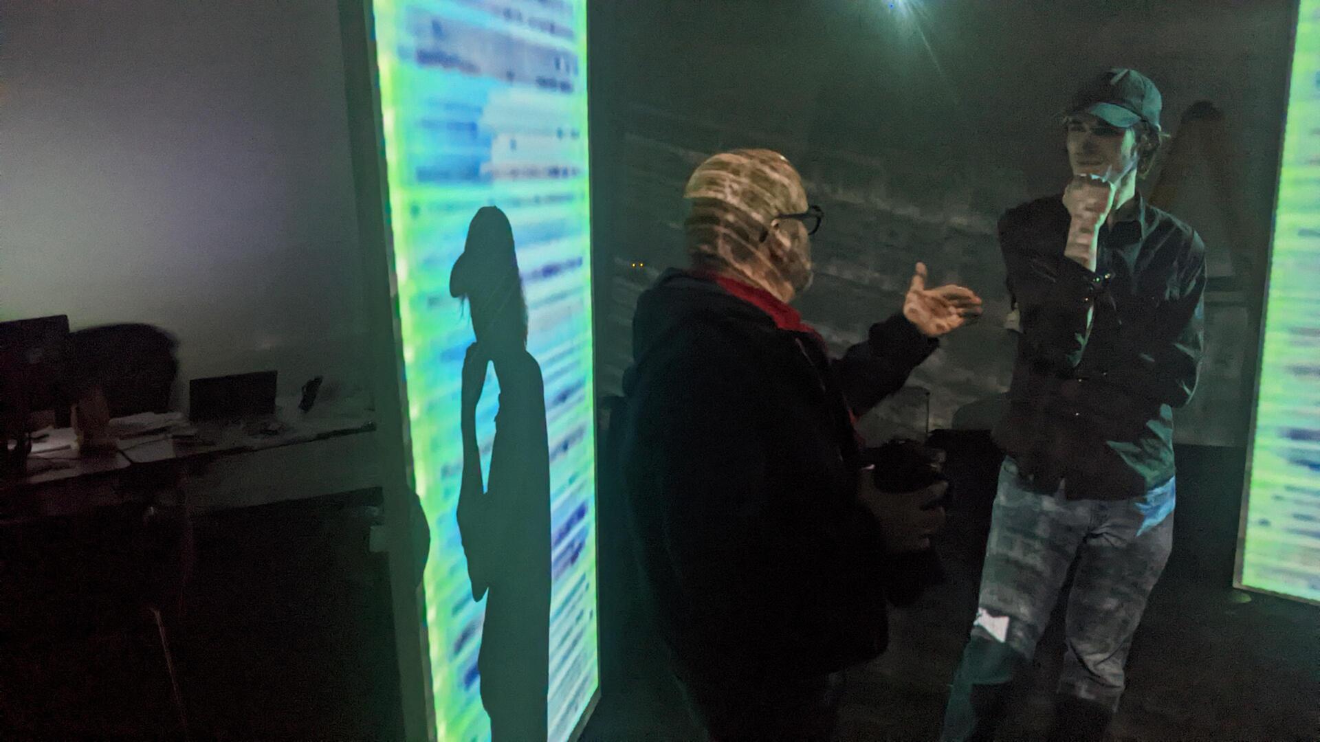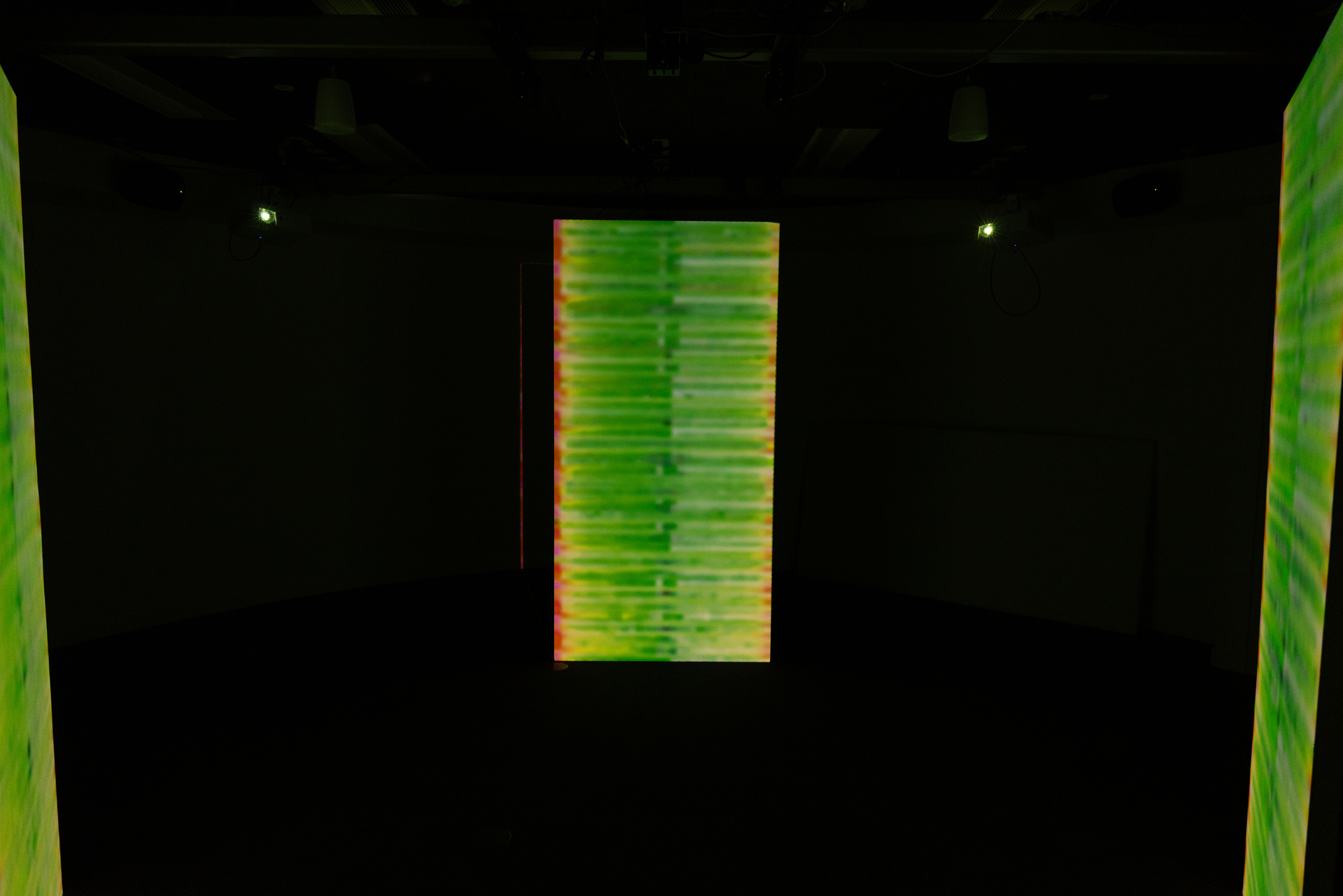 Autonomous processes translate person-driven interaction into system response. Within an auditory automated data feedback loop, human presence, monitored through shadow, triggers visual shifts in the pixelated colour and movement. Participants become unauthorised authors of the work, their actions absorbed and reinterpreted by a system whose logic remains partially obscured. Questions of control and agency remain unresolved. The exhibition comprises three freestanding obelisks, each presenting projection-mapped, pixel-based visuals. Operating as interconnected channels, each structure responds to its own distinct soundscape.